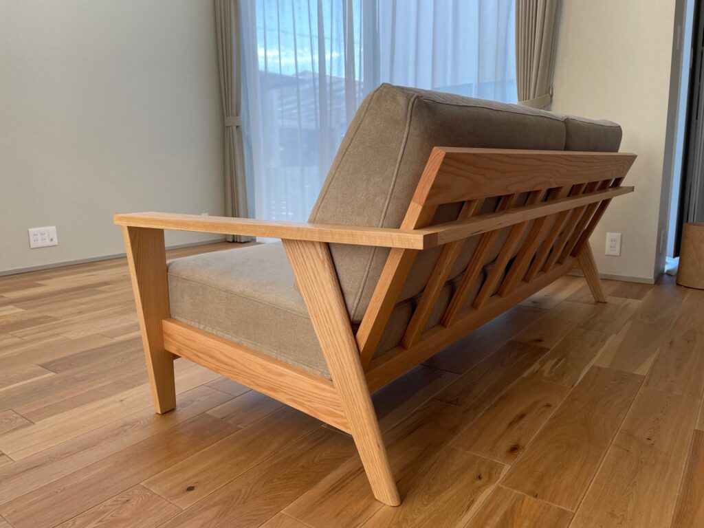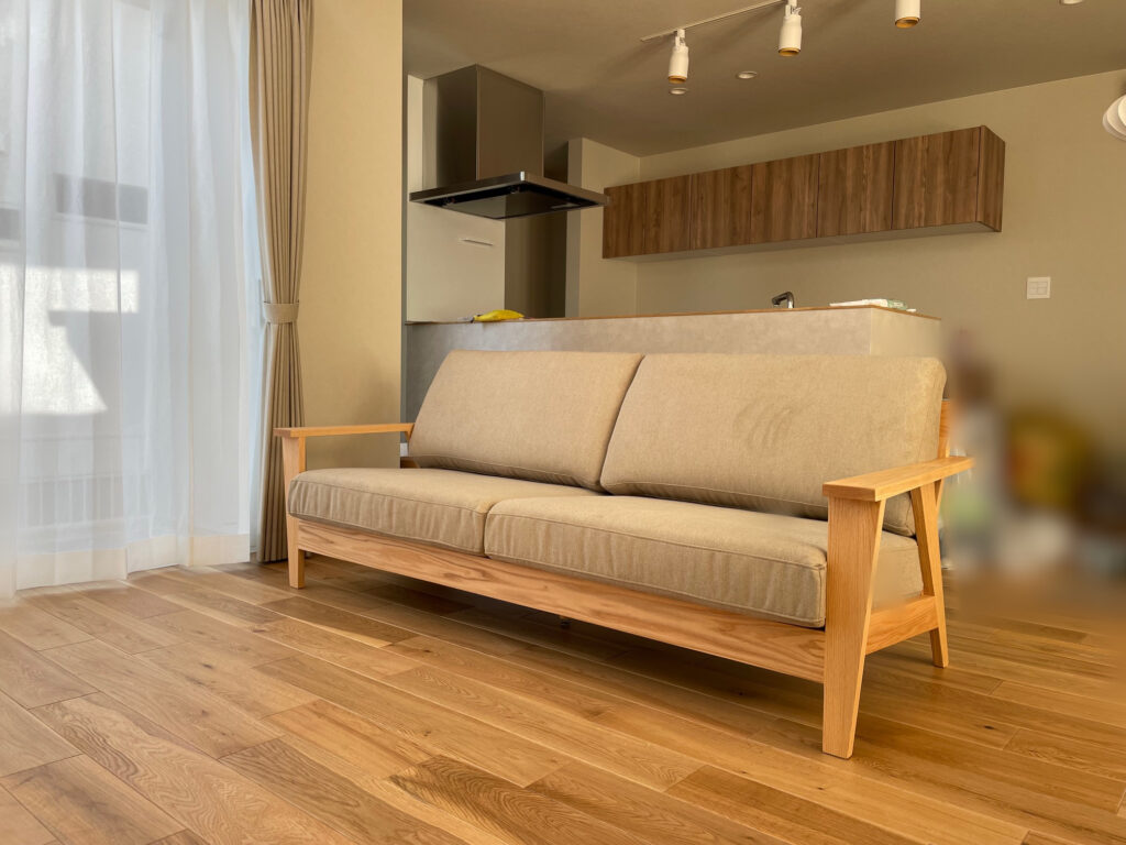 そしてキッチン前のリビングスペースには、バックショットがおしゃれなウッドフレームソファをセレクトされました。