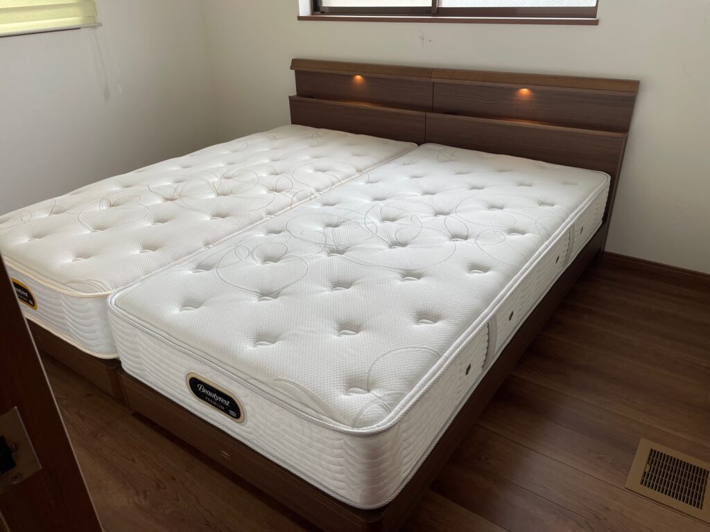 寝室にはシモンズのシングルベッドを2台、ツインでセットしました。