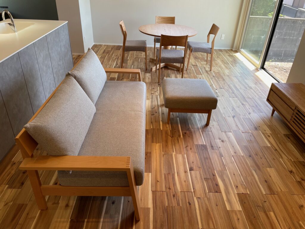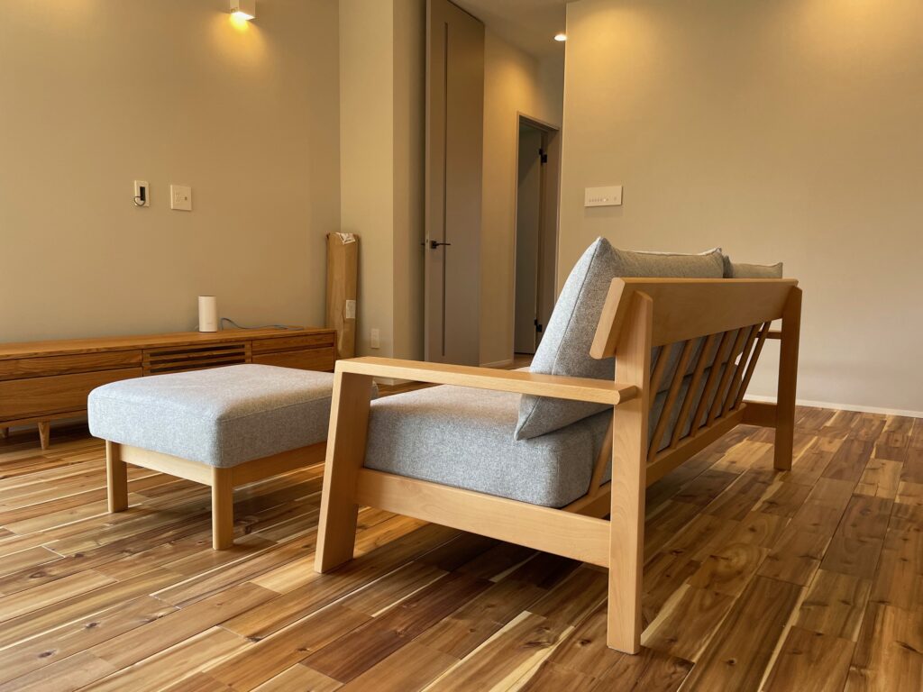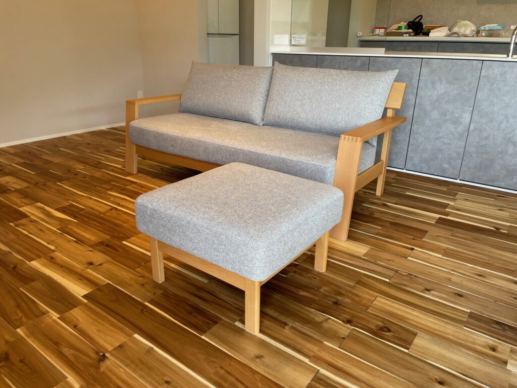まずソファは、飛騨産業のアームデザインとバックショットがおしゃれな、2.5人掛けソファ&スツールをセレクトされました。