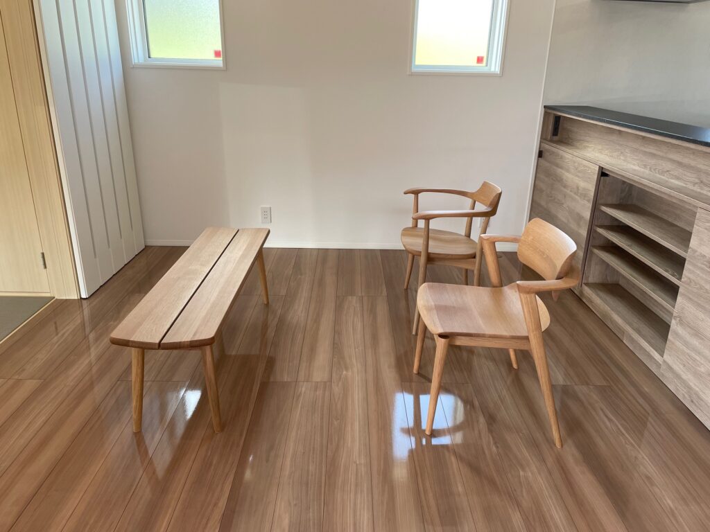 全体を板座で統一させた天然木の質感と優しさが伝わるダイニングです。