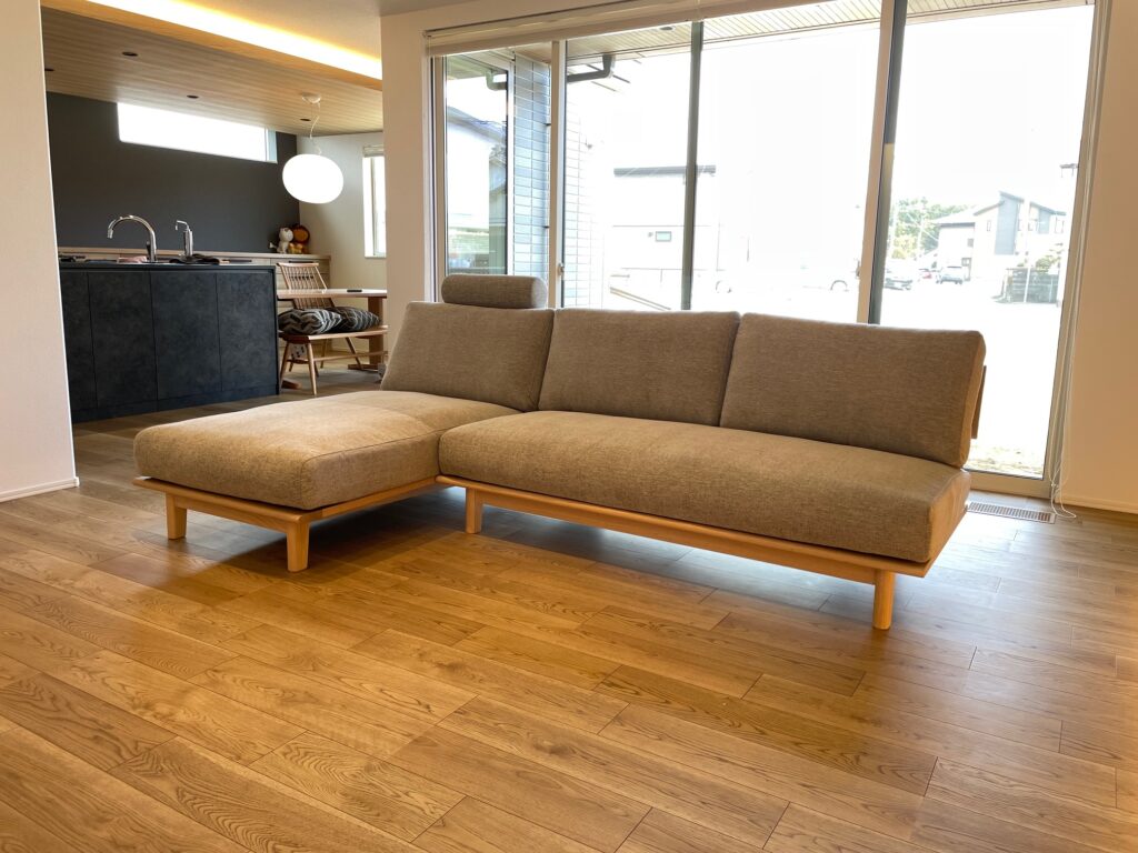 納品事例《オーク材の床にあわせたウッドフレームカウチソファ&サータ・三重松阪 K様邸》