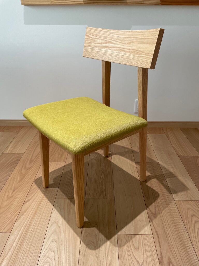 座面の張り生地はナチュラルカラーにもきれいになじむイエローグリーンをセレクト。