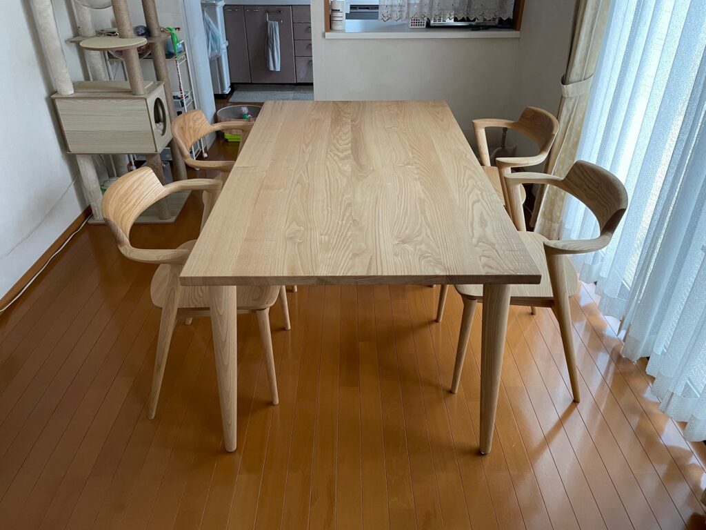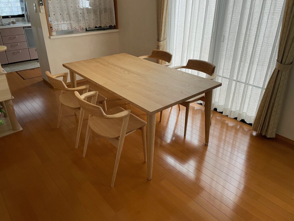 先日お届けさせていただいたソファもクリ材ということもあり、ダイニングもクリ材をセレクトされました。