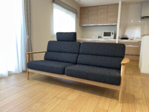 納品事例《リビングの中心でシルエットが映えるウッドフレームソファ・三重鈴鹿 I様邸》