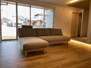 納品事例《オーク材の床にあわせたウッドフレームカウチソファ&サータ・三重松阪 K様邸》