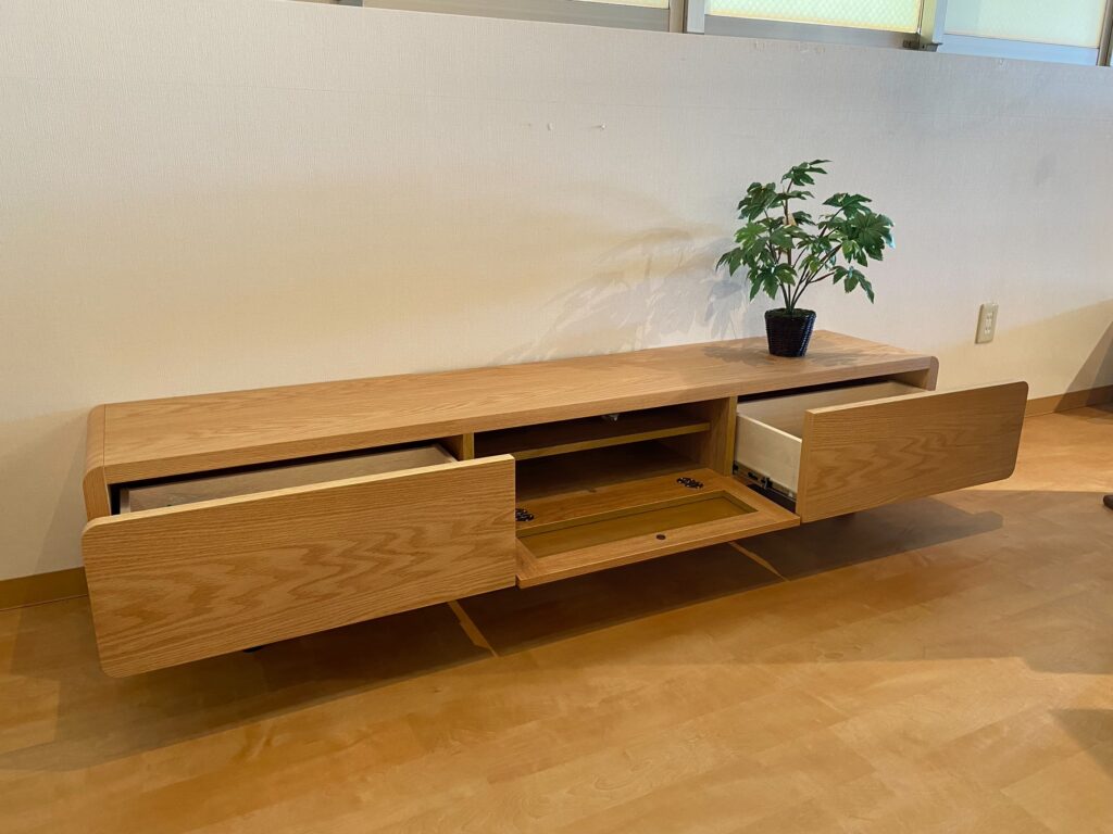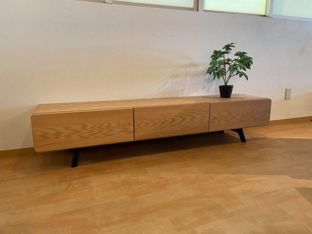天板のエッジを丸く、スッキリした正面、脚付きのデザインで抜け感のある軽やかなテレビボードに仕上がっています。
